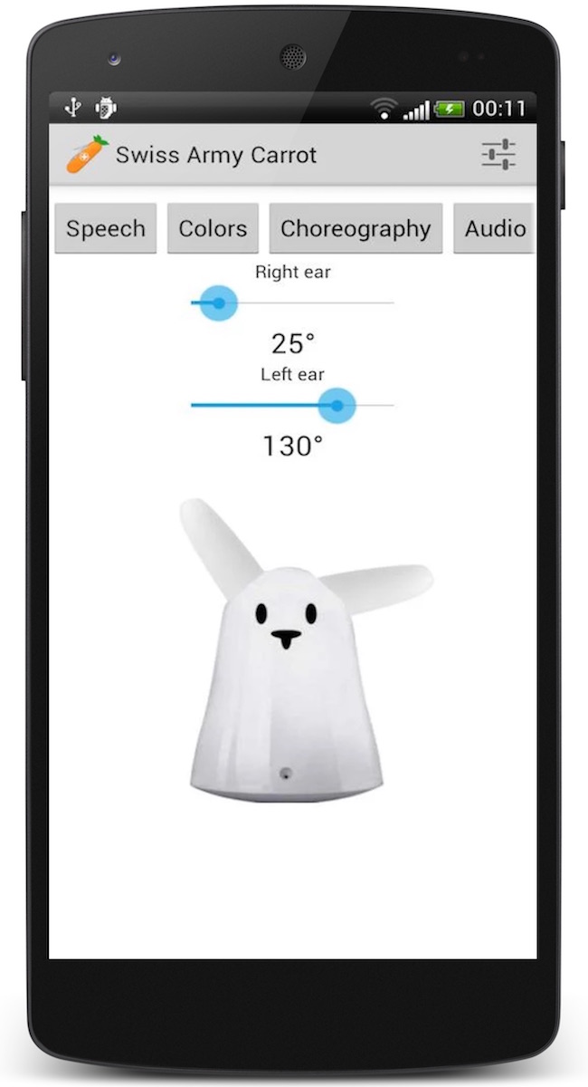 Swiss Army Carrot was the first Android app I ever made. It connected to the real life robotic bunny rabbit, Nabaztag, and let you control it through the app. On top of regular controls for the Nabaztag, Swiss Army Carrot also featured a dance choreography system that let you pre-program light and ear movements.